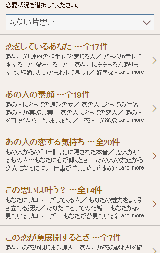 他にも、恋愛状況別に様々な恋愛占いが楽しめます!それぞれの状況別に数十の占いメニューが用意されているのにビックリ!